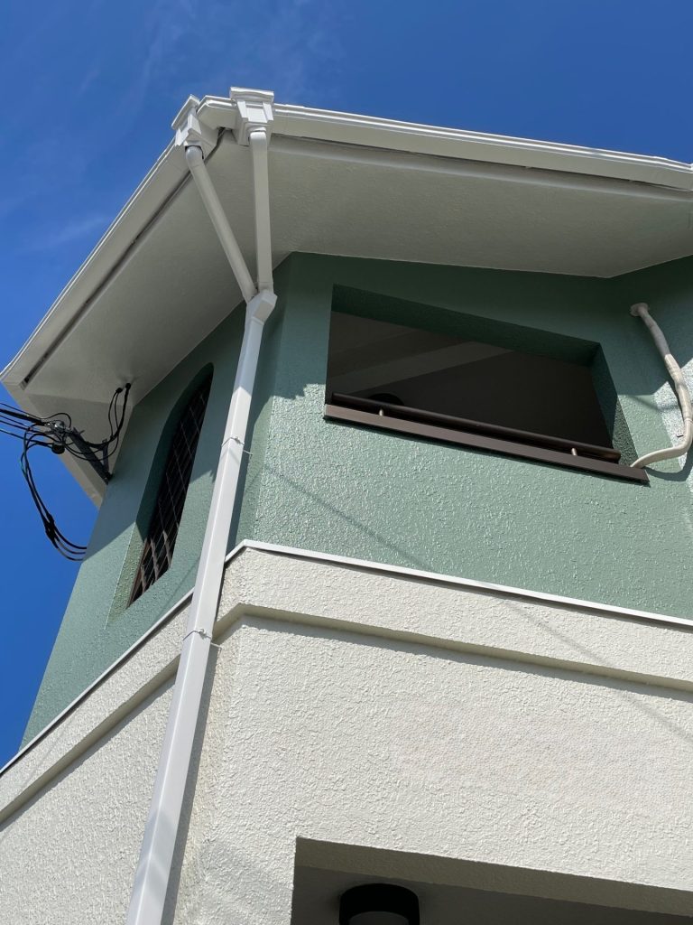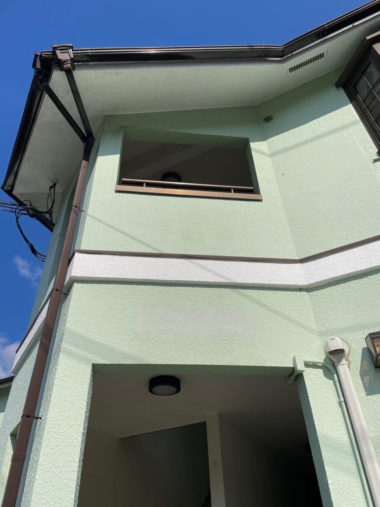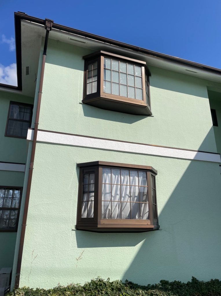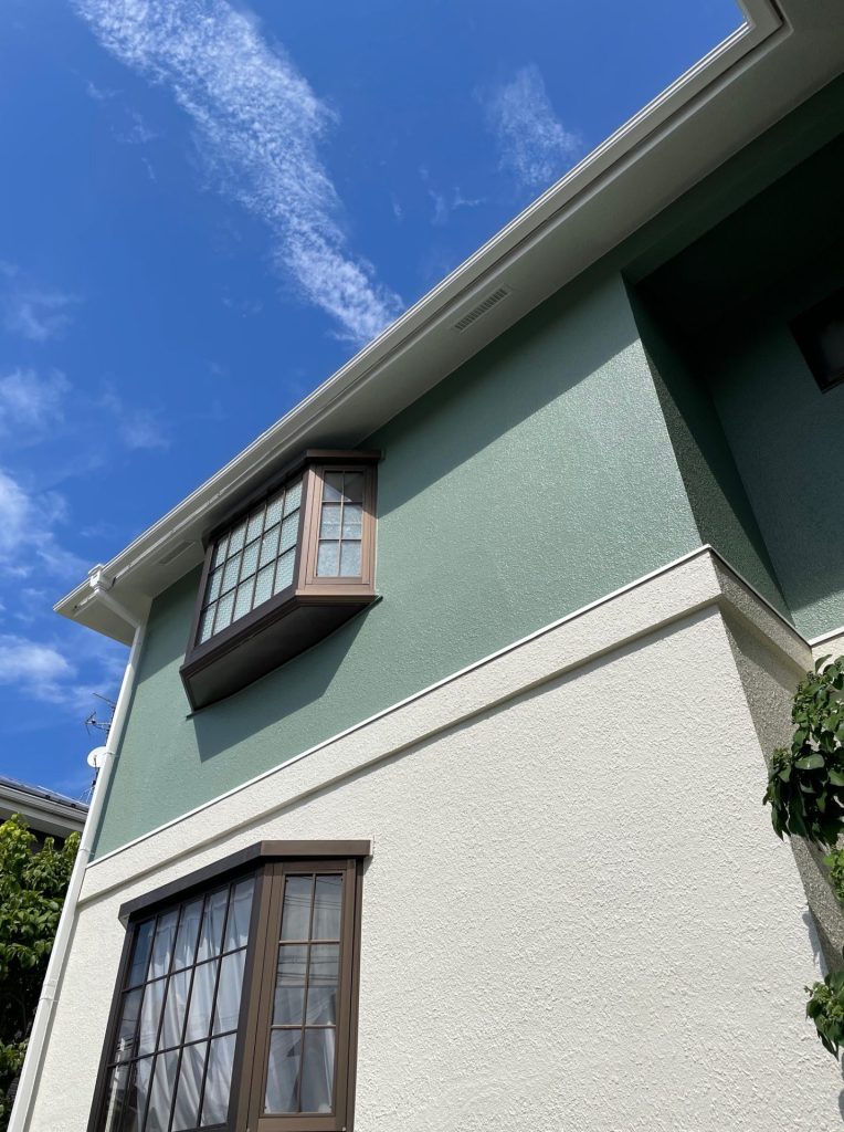 外壁色はグリーンがお好みということで今回もグリーンを使いましたがどうせ塗り替えするのなら少し変化を付けましょうということで以前よりも落ち着いたグリーンを用いたツートンの配色をご提案させていただきました。