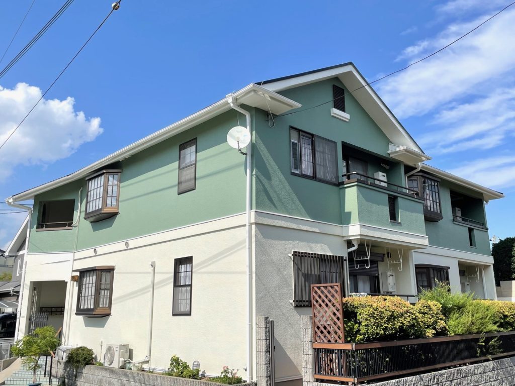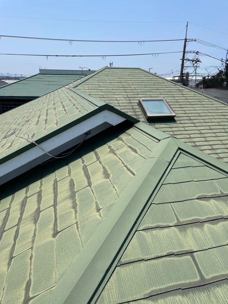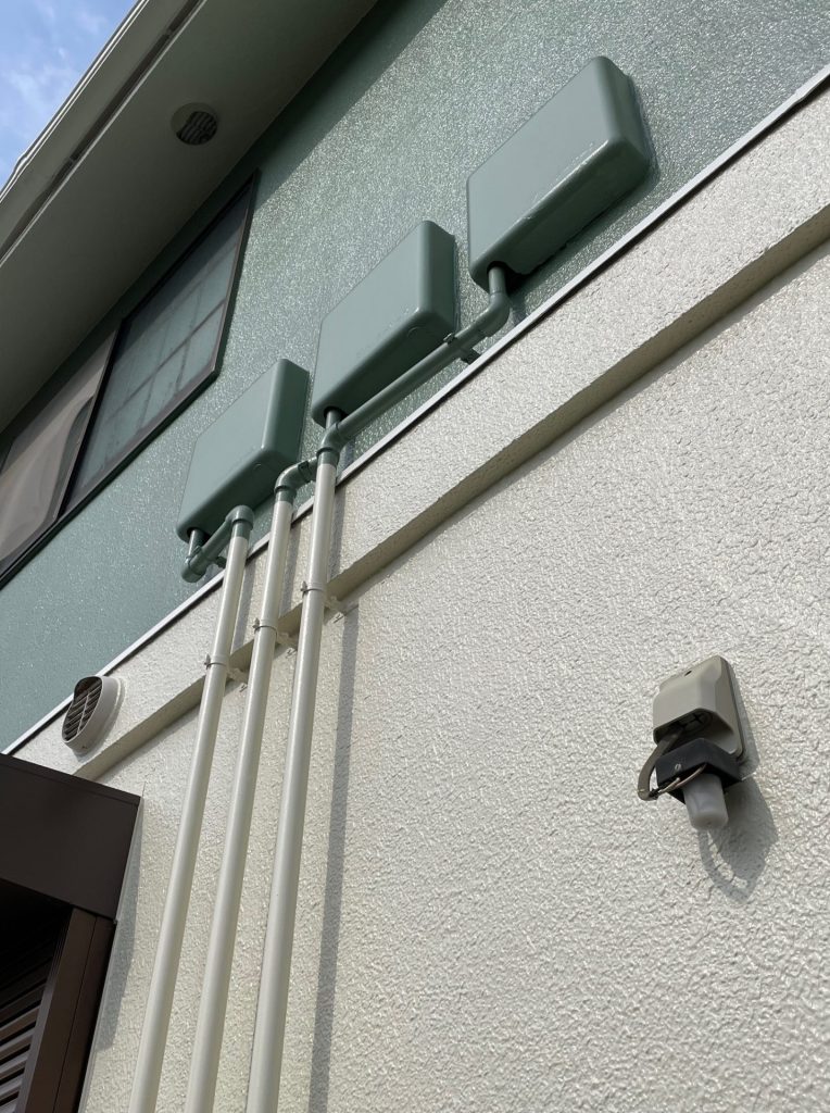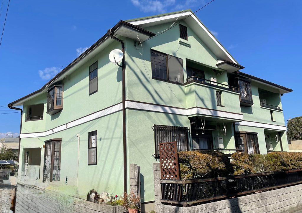 外壁色はグリーンがお好みということで今回もグリーンを使いましたがどうせ塗り替えするのなら少し変化を付けましょうということで以前よりも落ち着いたグリーンを用いたツートンの配色をご提案させていただきました。